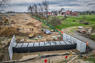 After weather and scheduling setbacks stretching back to December, crews on Thursday installed the culvert for the future roadway connection between…