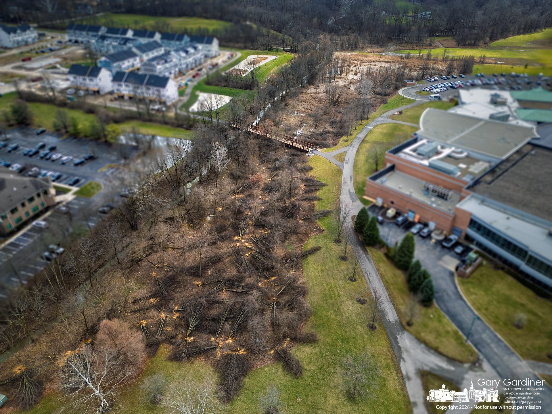 Piles of freshly cut Callery pear trunks and tangled honeysuckle now line the banks of Alkyre Run behind the Westerville Community Center, marking the first visible step in restoring the stream’s long-altered wetland and floodplain. Crews removed roughly 200 Callery pear trees and about 100 honeysuckle shrubs from the four-acre site, according to the arborist supervising the clearing, to prepare for a project designed to improve water quality and restore wetland habitat before stormwater reaches Alum Creek.
