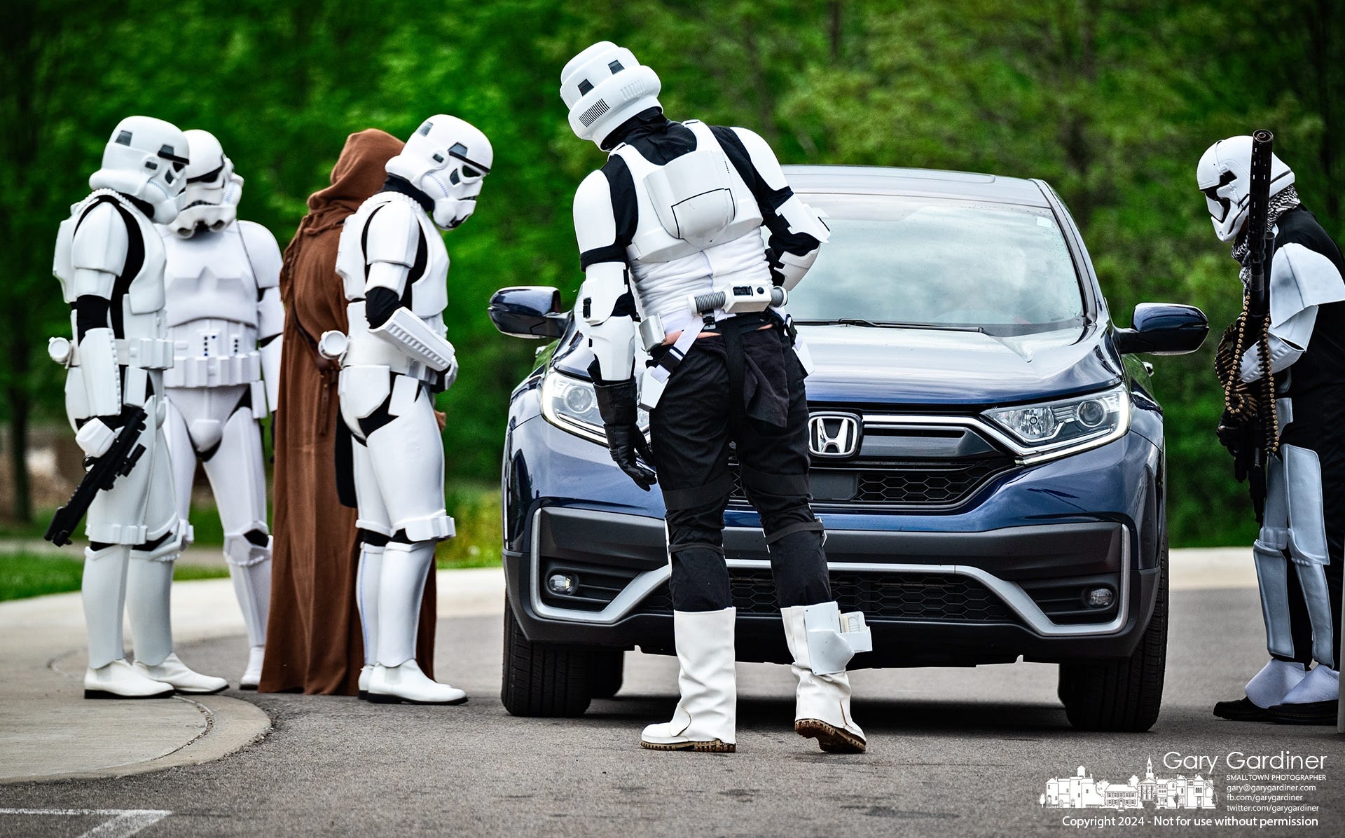 A squad of Stormtroopers conducted inspections for particular drones and potential Rebel fighters at a checkpoint located at the Community Center on Cleveland Avenue. No Rebels were apprehended. Additionally, food donations for WARM were gathered from each vehicle that underwent the inspection process.