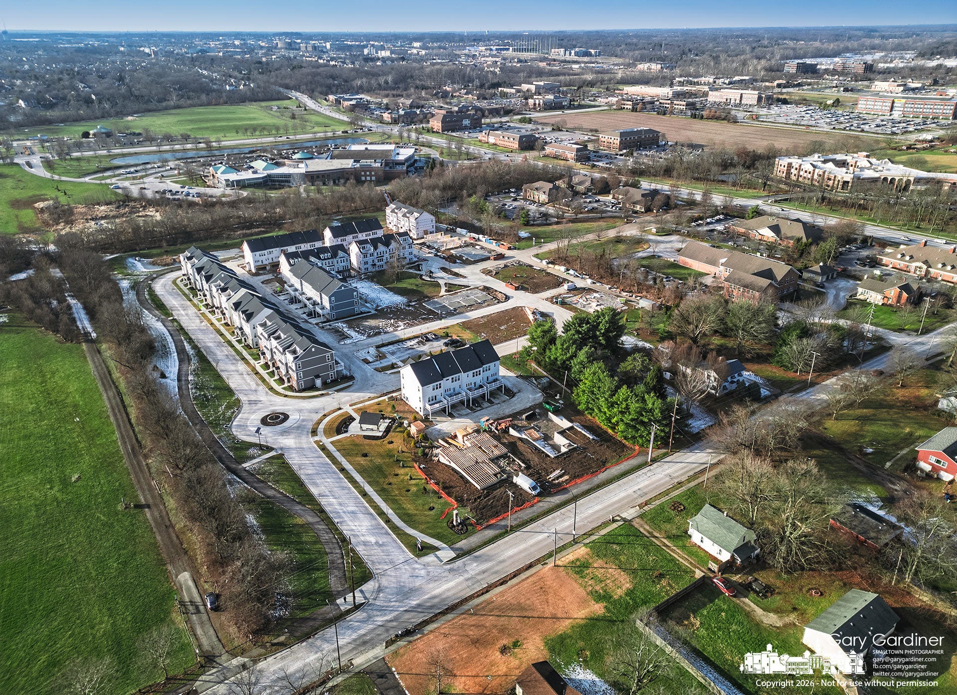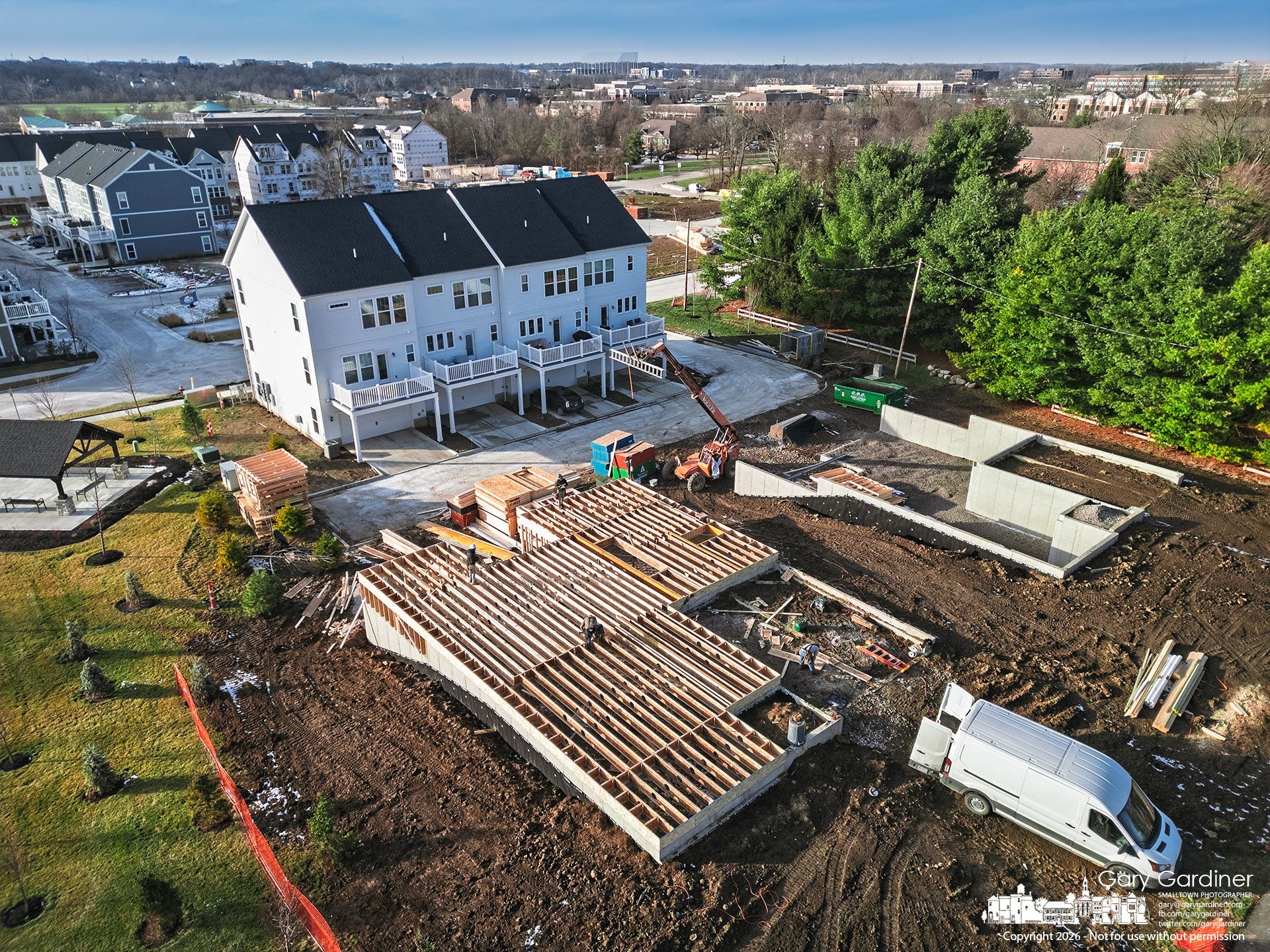 Carpenters install joists for the first floor of one of two single-family homes facing North West Street at the front entrance to Towns on the Greenway, a neighborhood of townhomes being built near the community center.