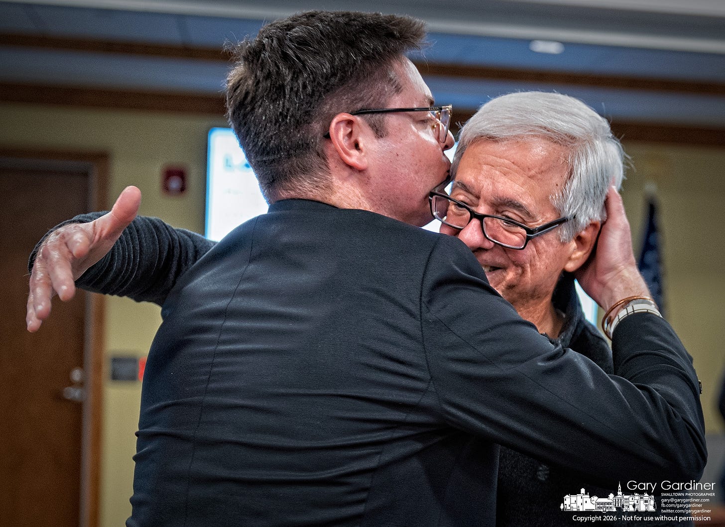 Michael Heyeck, who served 32 years on the city council and a total of 40 years of service to Westerville, receives a kiss from David Grimes after Heyeck thanked them for giving him a key to the city during a ceremony honoring his time with the city.