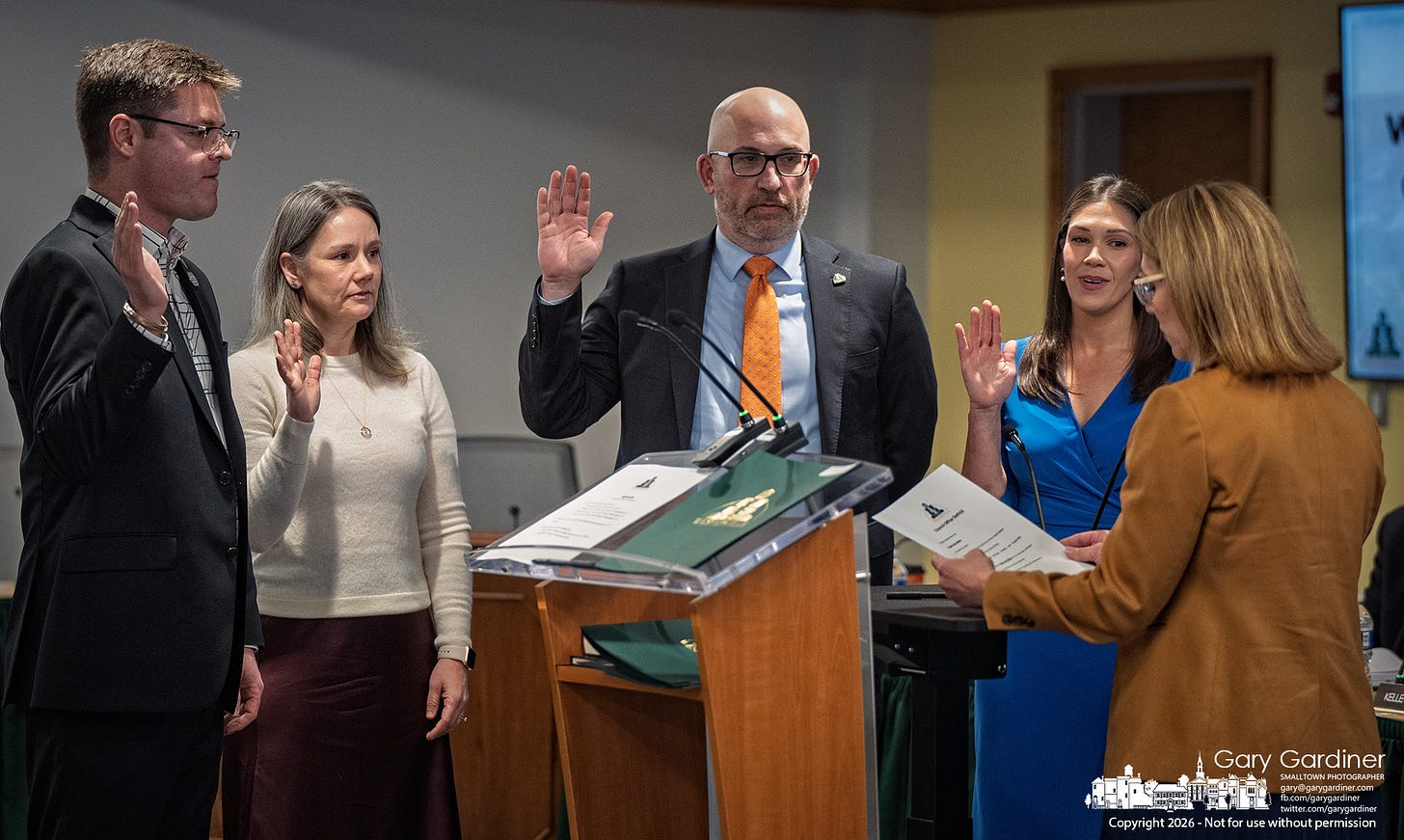 Before the first meeting of the Westerville City Council on Tuesday, two new members were sworn in, and the new mayor and council chair were selected.