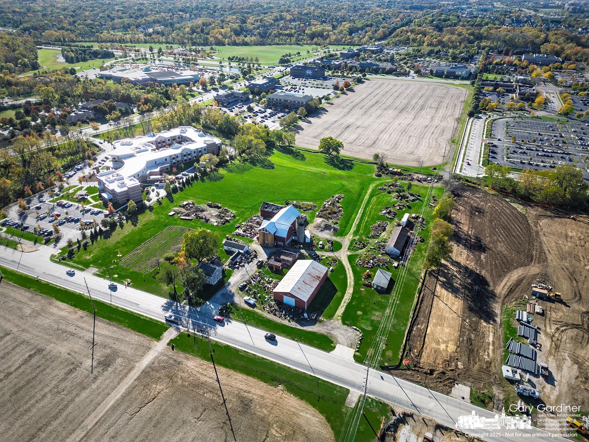 The Yarnell Farm, center, sits immediately south of the East of Africa development site at right. The brown fields in front of and behind the barns are recently harvested soybean plots. The newly graded connector from Westar Boulevard extends along the right edge, awaiting curbs and gutters once the surface dries.