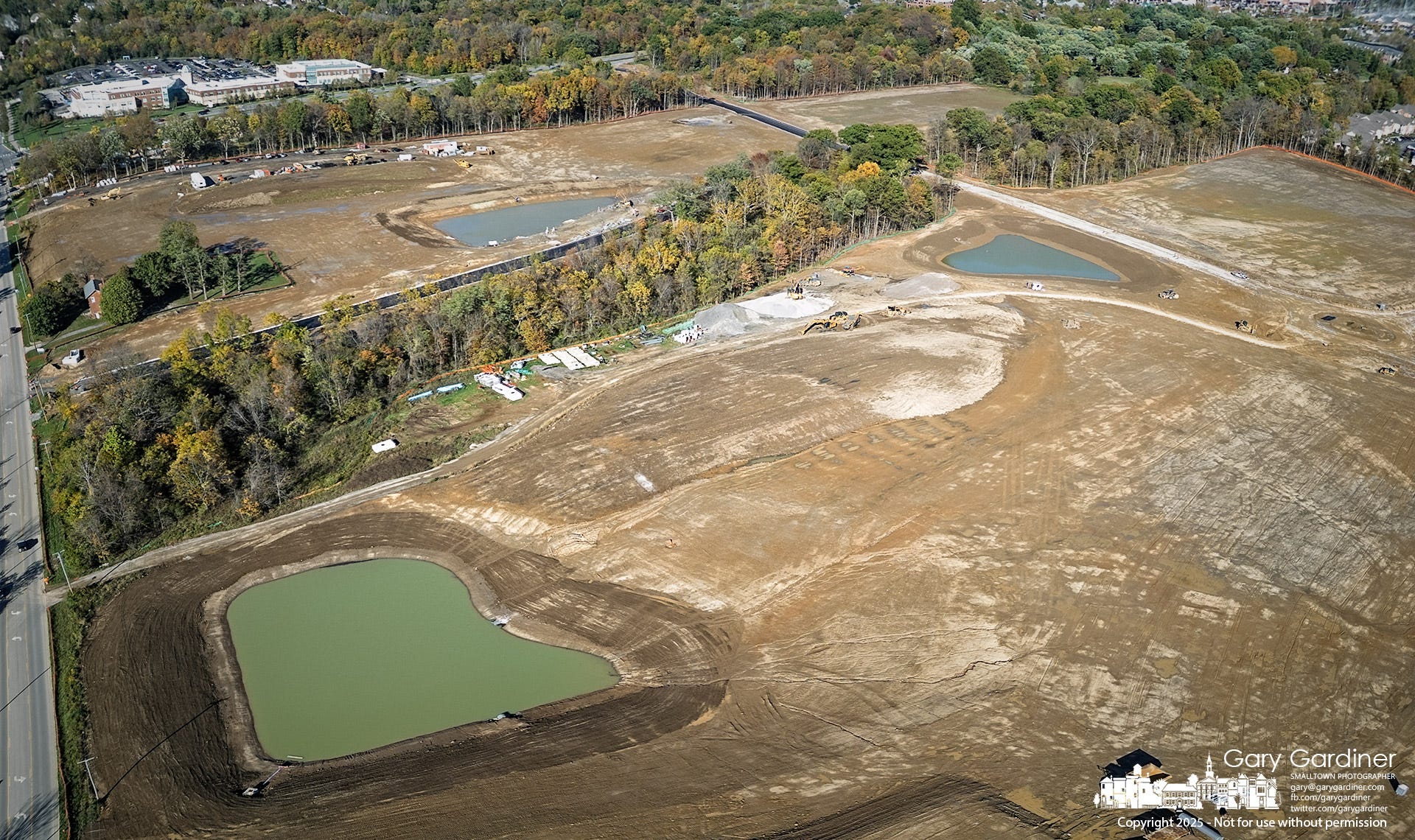 At the north end of the project, the three newly formed retention ponds are designed to manage runoff from the future roadways and building sites. The roundabout and adjoining unfinished roadways are just beyond them, still awaiting curbs and final paving. For now, the ponds also serve as a reminder of how much rainfall the site must absorb and manage before work can resume at full pace.