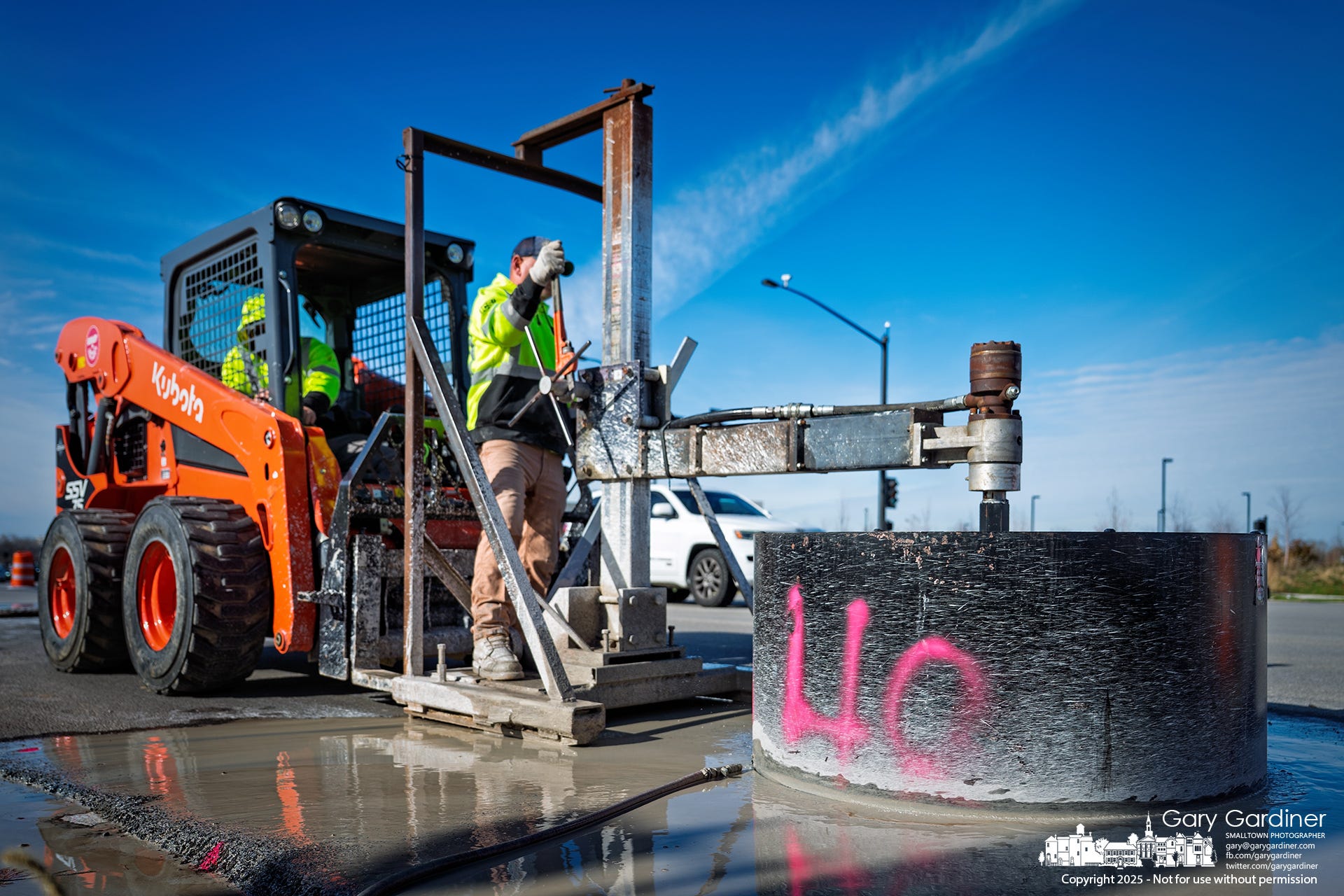 Road crews spent Monday removing the asphalt collars around eight manholes on Africa Road and Polaris Parkway, a process that required rerouting traffic around each work zone. Using a hydraulic coring machine mounted to a compact loader, workers cut clean circular sections of pavement, lifting out the old asphalt to make way for stronger concrete replacements.
