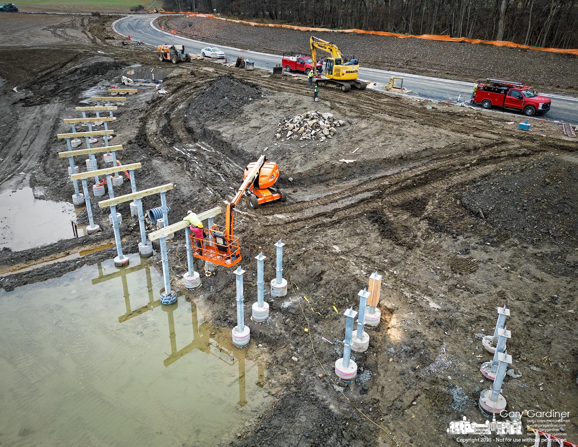 Recent rain left the work zone muddy, but crews continued installing supports, grading soil, and working along the pond’s edge. As more pylons go in, the boardwalk's shape is becoming clearer, marking the shift from groundwork to a more visible stage of construction.