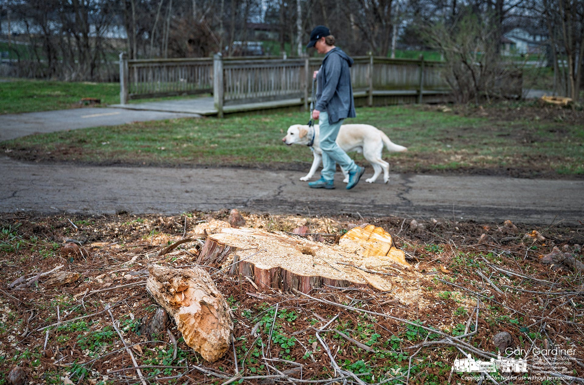 A woman walks her dog along a footpath where cypress trees have been removed to make way for the renovation of Walnut Ridge Park. The changes will reduce the number of baseball fields from three to two, reroute the stream to a more natural course, and create a wetland in the outfield of the removed field that was unplayable after rainstorms.