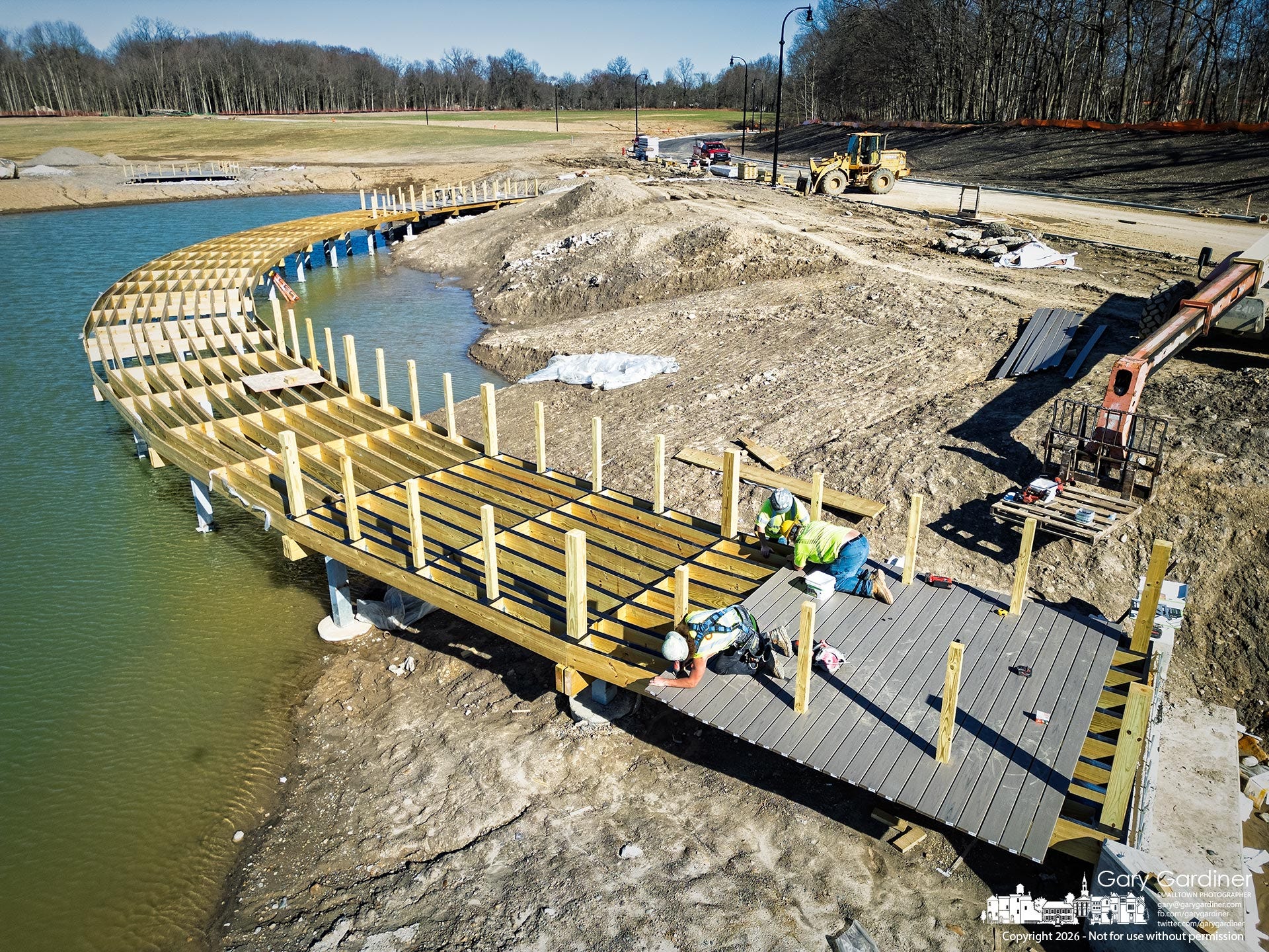 Construction continues on the walkway along one of the holding ponds as the contractor takes advantage of warmer weather to make up time lost during the colder months.