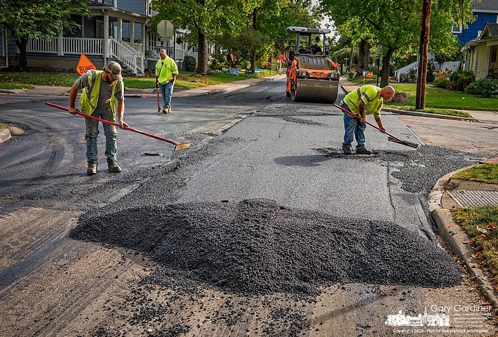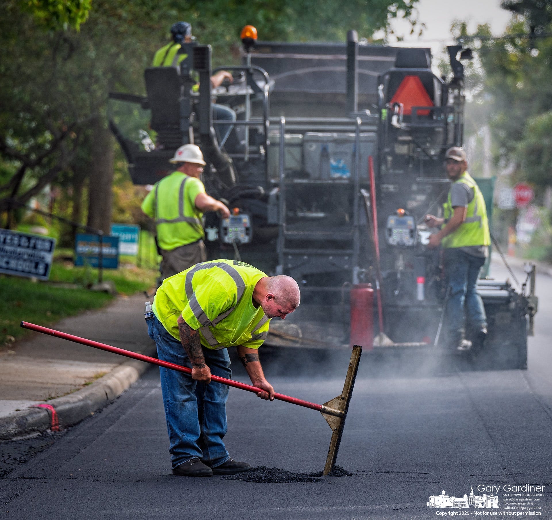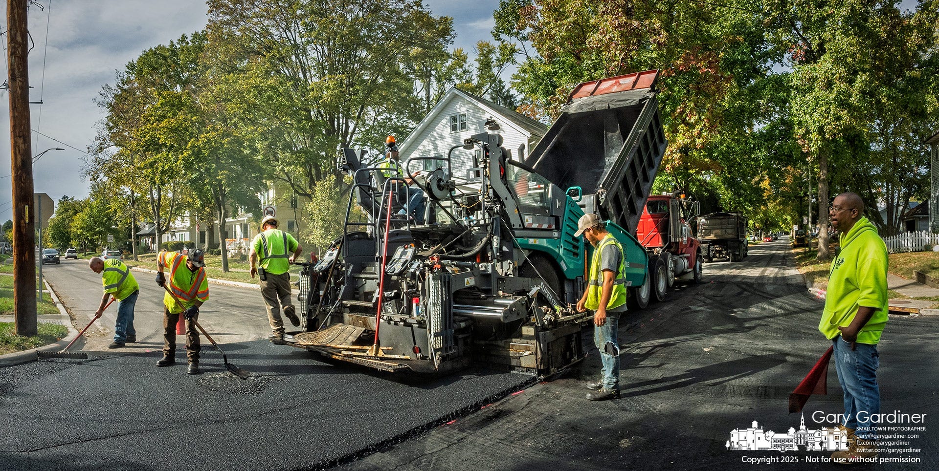 During the work, traffic crews helped guide cars and pedestrians safely through the area. Friday’s paving was briefly delayed when an asphalt truck accidentally struck an overhead power line, bringing it down and stopping work until the line was cleared.