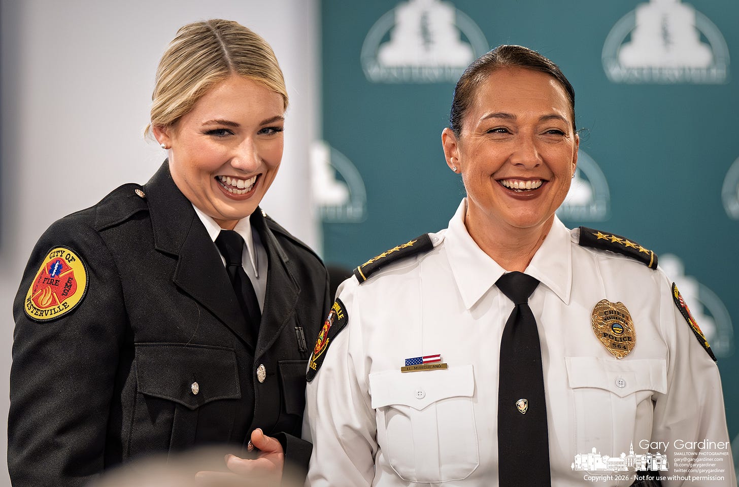 Morgan Murchland, left, laughs with her mother, Westerville Police Chief Holly Murchland, before the start of city council Tuesday night, where the younger Murchland was sworn in as a Westerville firefighter, joining her mother as a city first responder.