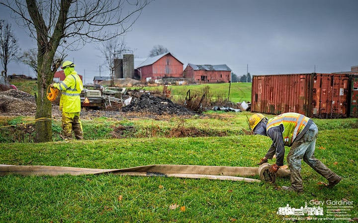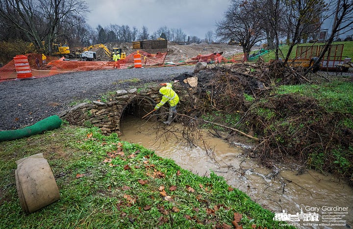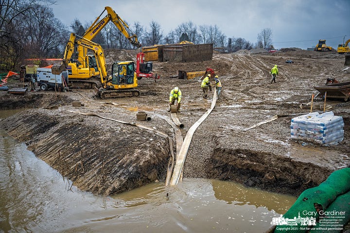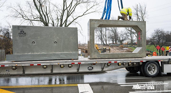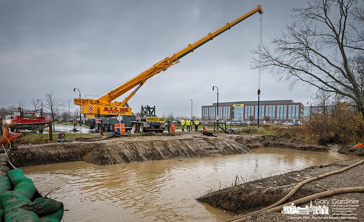 Crews arrived ready last week to install the concrete culvert for the future roadway connecting Africa Road to Westar Blvd., part of Westerville’s 88-acre East of Africa development. The plan was clear. A crane would lift eight precast culvert sections along with the paired headwalls into the excavation. Each section needed to be placed in order, sealed to the next, and fully grouted to prevent leaks once water starts flowing through the structure. It took about a dozen semi-trucks to deliver the pieces.