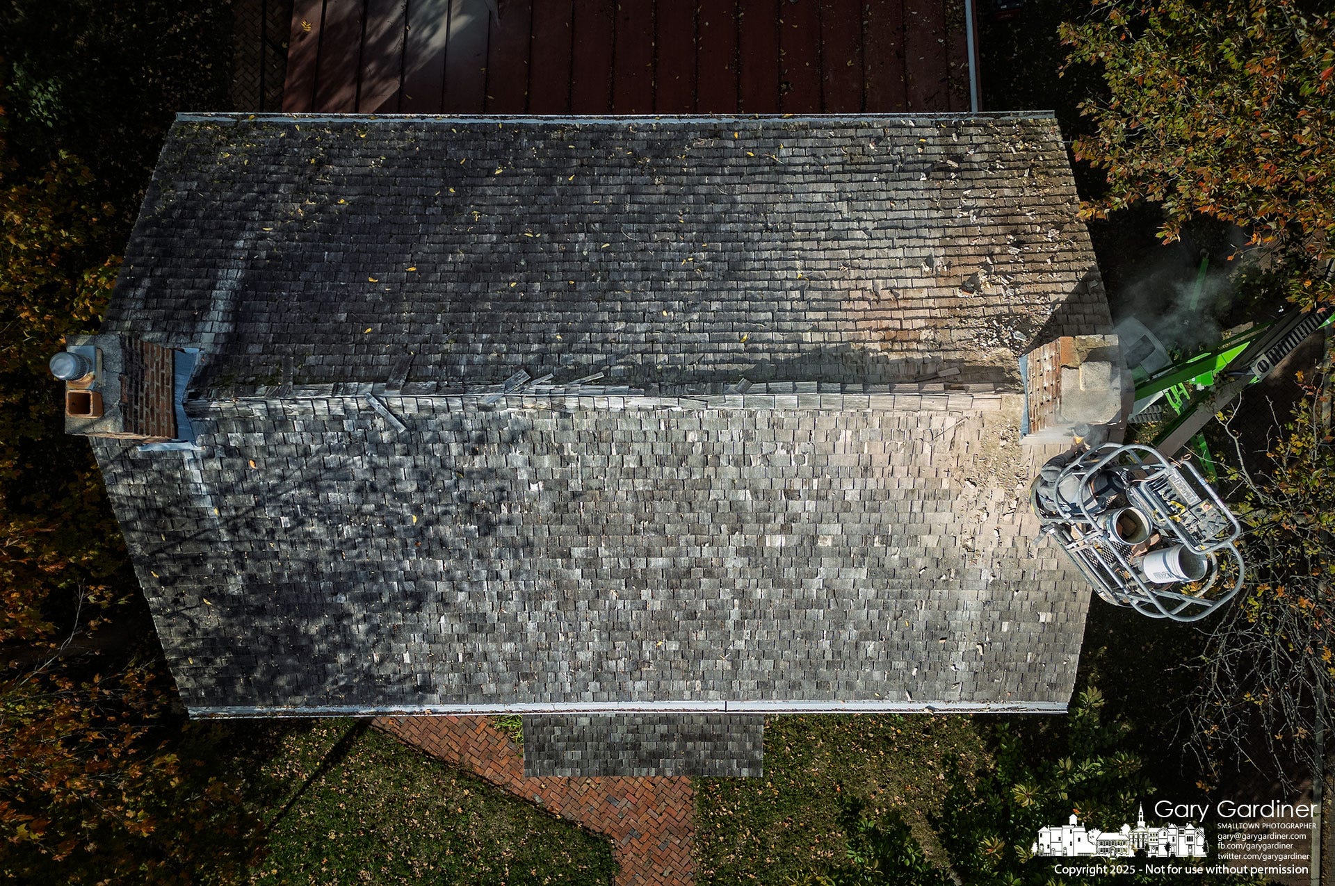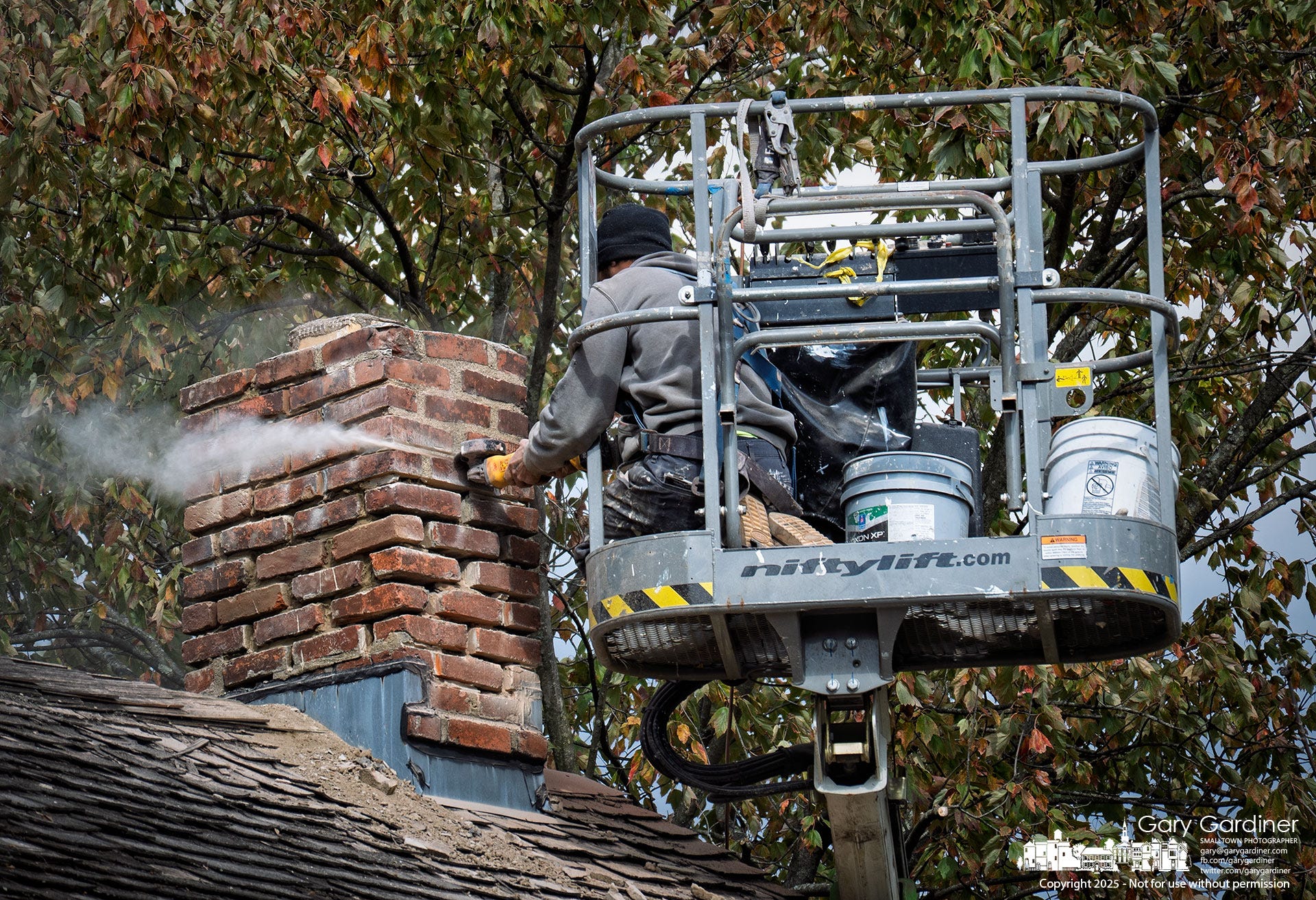 The process is more difficult than a regular tuckpoint job, as the chimneys were found to be more decayed than first thought, and the matching mortar mixture is an unusual one that dates back to when the chimneys were built after the house was moved. The cedar shake roof is also scheduled to be replaced over the winter.