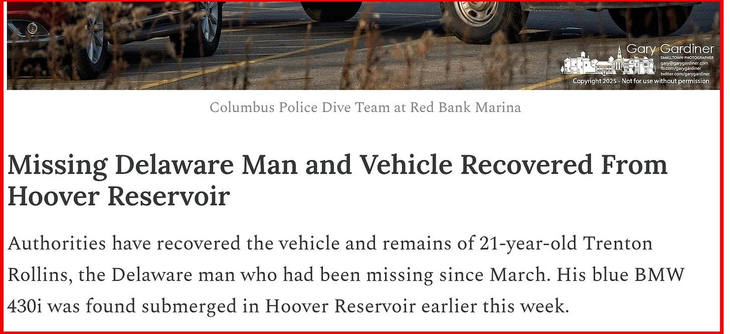 The independent search-and-rescue group, hired by Rollins’ family, located his blue BMW 430i submerged in the reservoir in early December 2025 using sonar. The recovery was completed with assistance from the Columbus Division of Police Dive Team and Hoover Reservoir rangers.