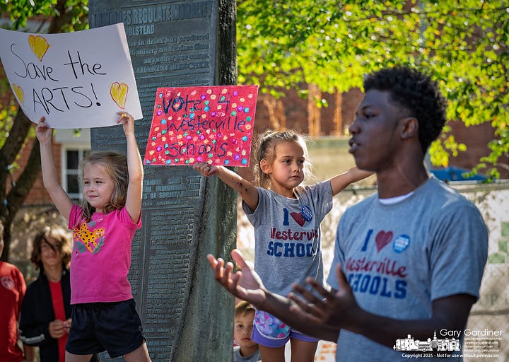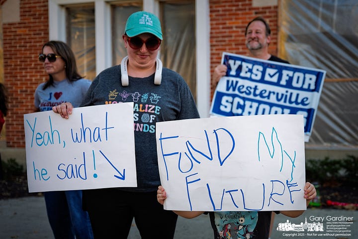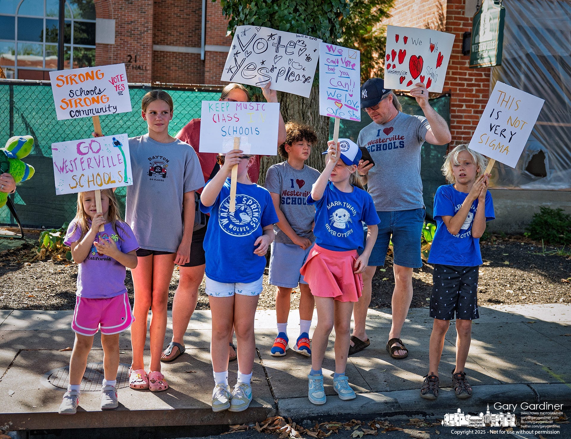 Several hundred Westerville School students and their families carried homemade signs and gathered in front of City Hall on Sunday, urging voters to approve an income tax to fund the school system.