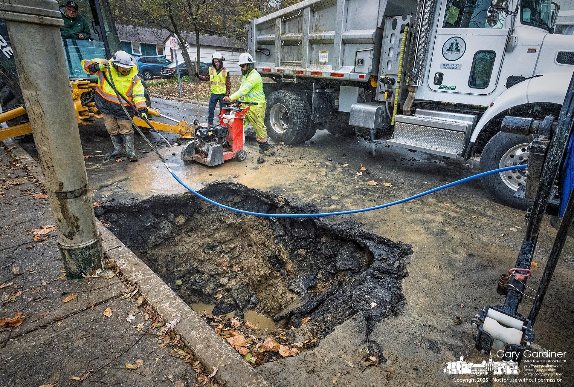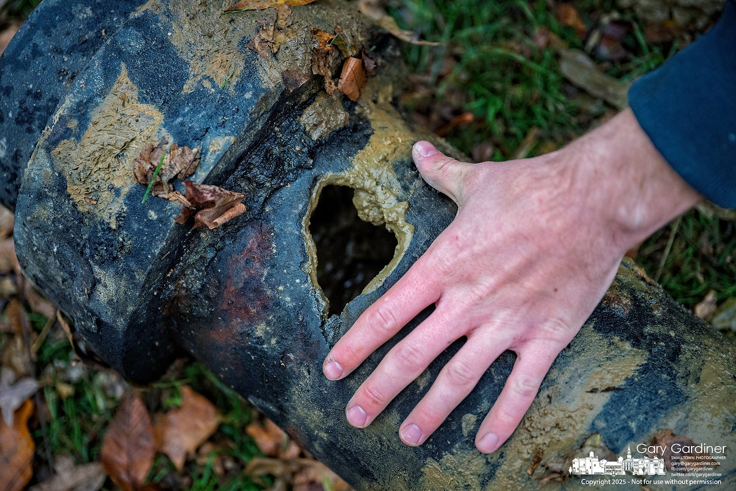 The break occurred near Grove Street next to Otterbein Cemetery, exposing a 50-year-old cast iron pipe with a large, heart-shaped hole near the connection point between two sections. Because of the location of the rupture, a standard clamp repair wasn’t possible.
