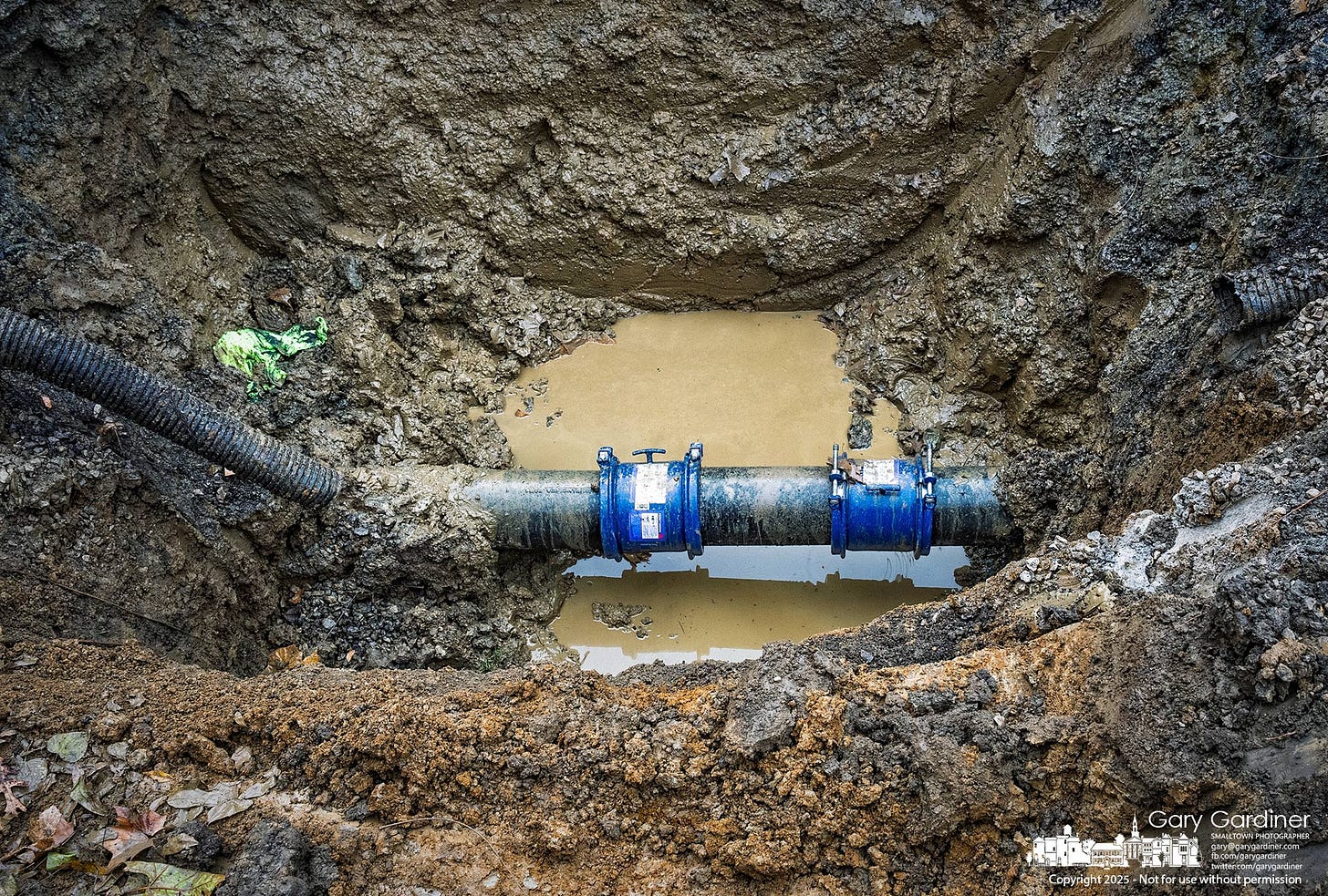 Using a backhoe, workers cleared the area around the break while a vacuum truck removed standing water from the trench. A new section of pipe was installed and sealed with dual couplings on both ends. Water service was restored shortly after the repair.