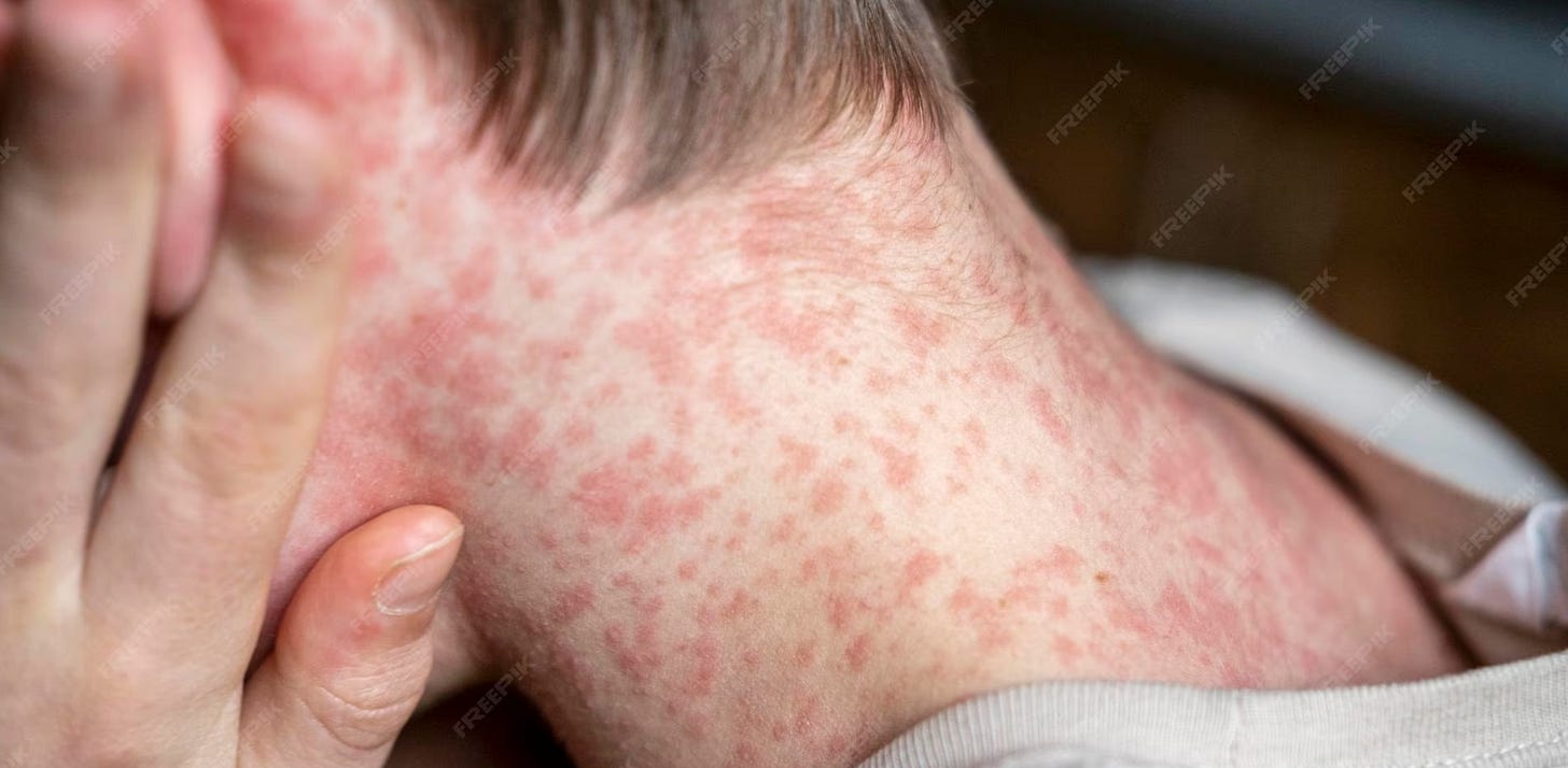 Measles is a highly contagious disease that can cause fever, rash, cough, and red, watery eyes. In some cases, it can lead to serious complications.