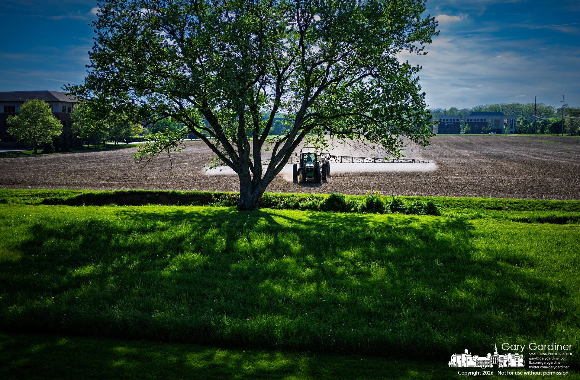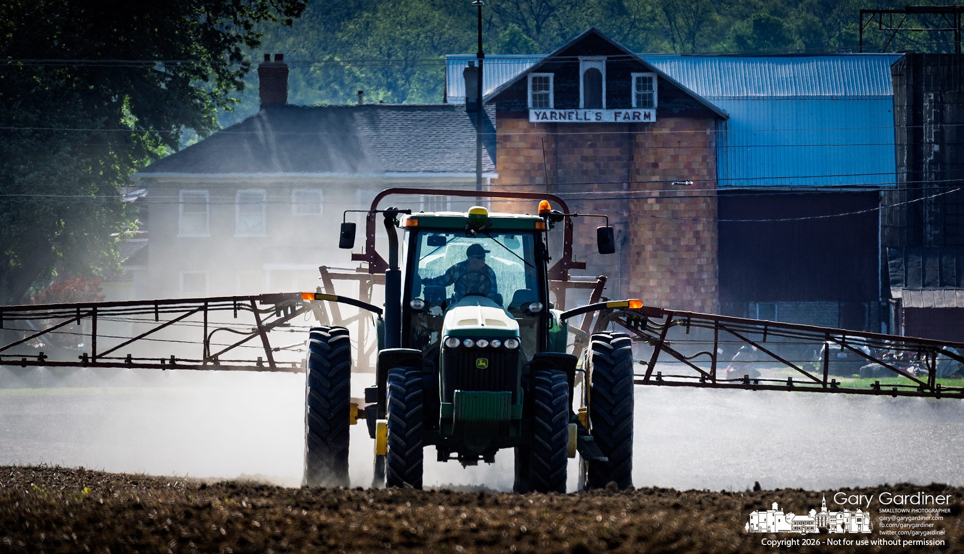 A McNamara Farms tractor quietly pulled into the Yarnell Farm field, extending its 60-foot sprayer arms to apply pre-emergent herbicide, preparing the land for planting.