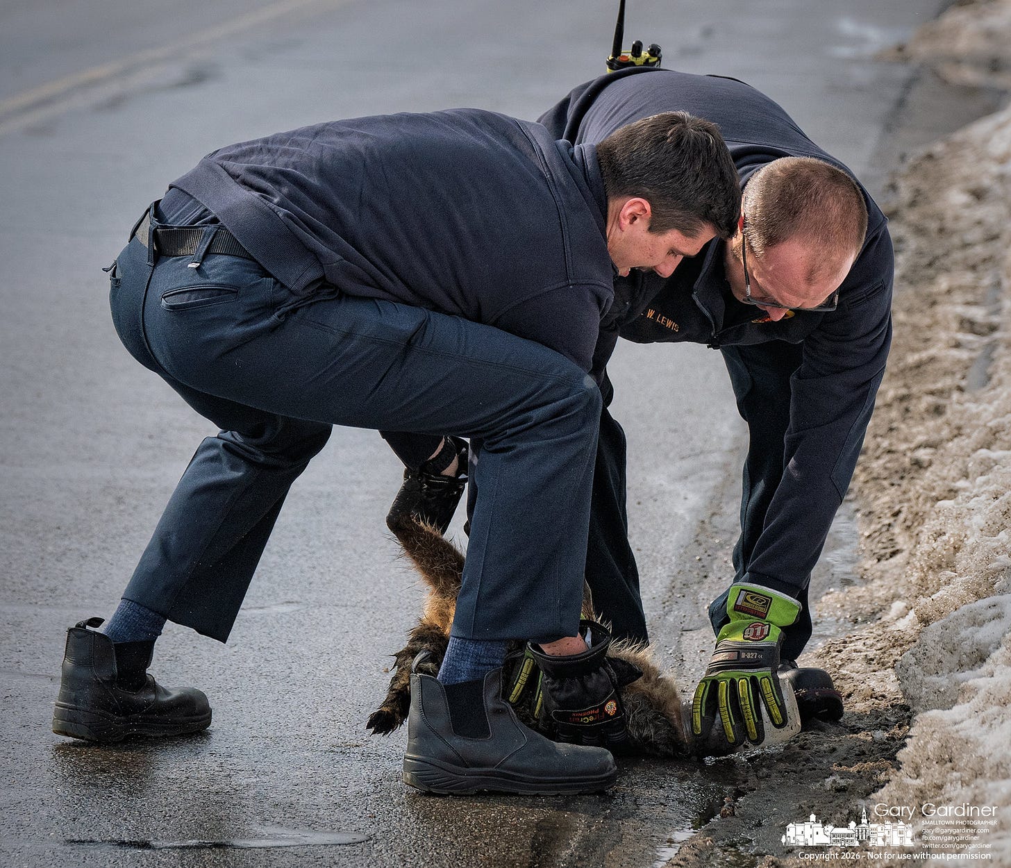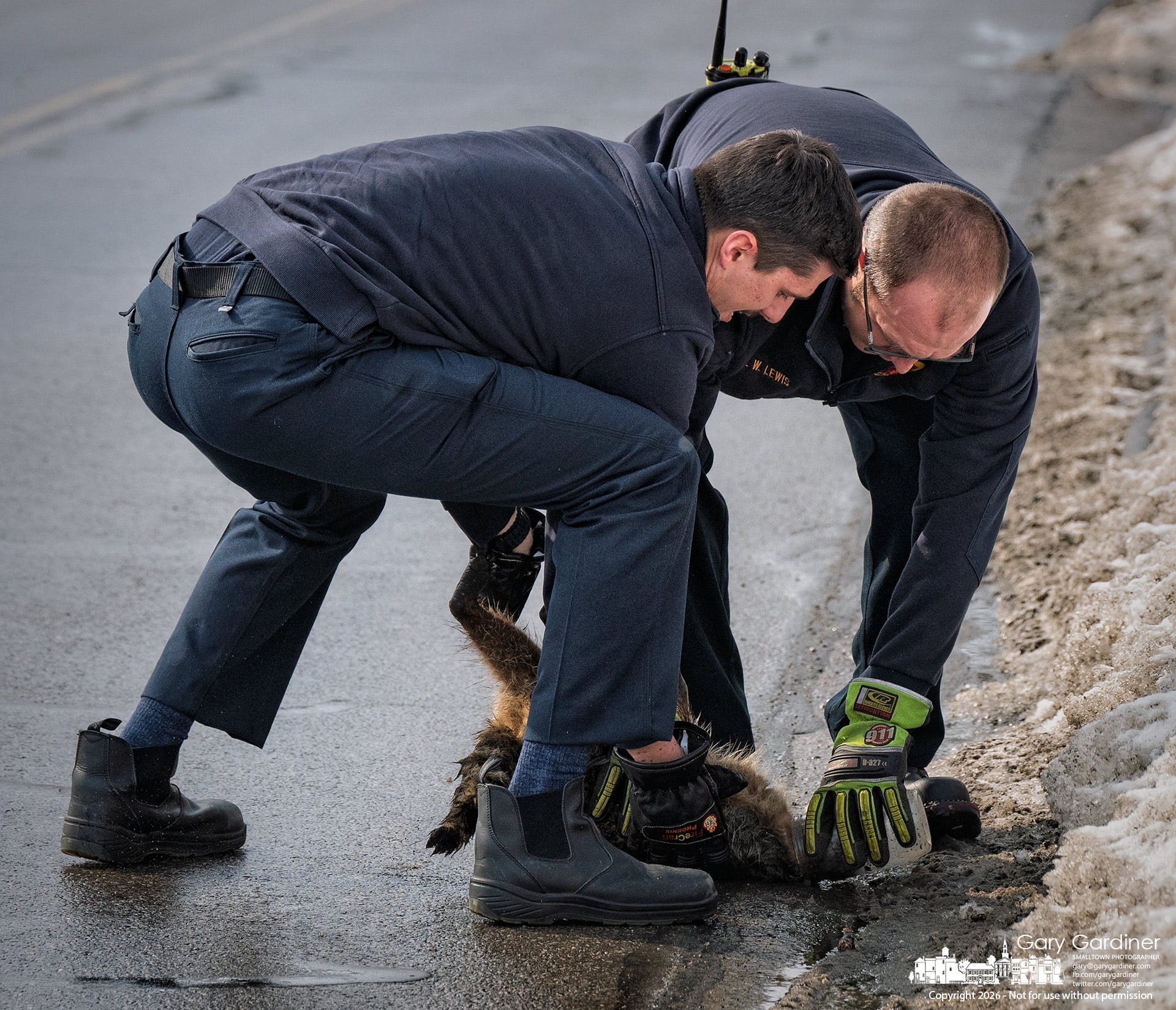 Firefighters stopped and stepped in, wearing standard duty gloves to safely handle the animal. They cornered the raccoon against a snowbank, where one firefighter held it steady while the other pulled the jar free.