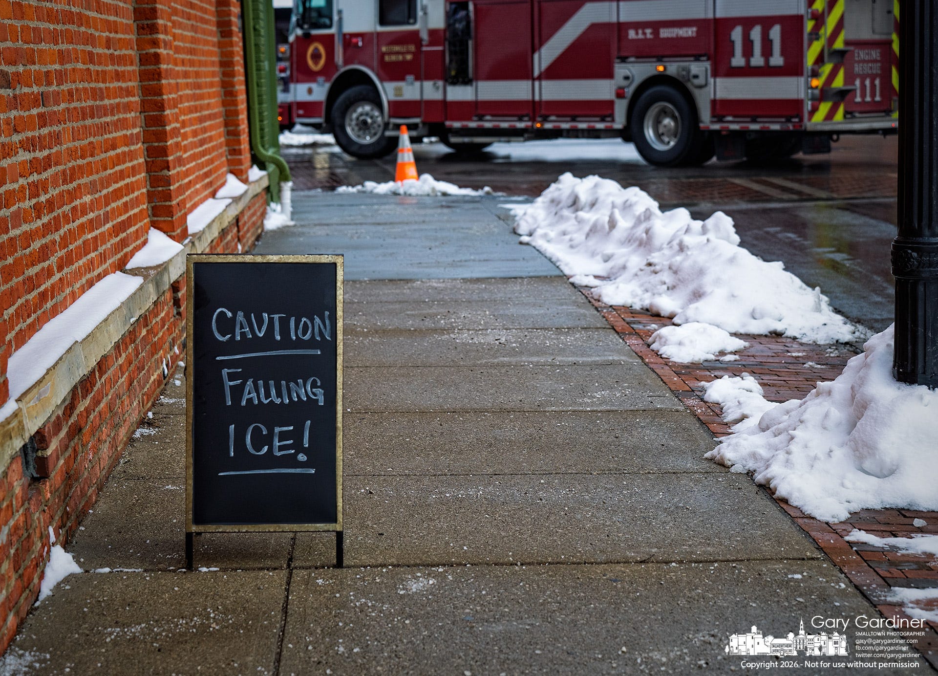 Warning signs have been placed along sidewalks to alert pedestrians to falling ice. Residents are urged to use caution near buildings as crews continue to monitor conditions.