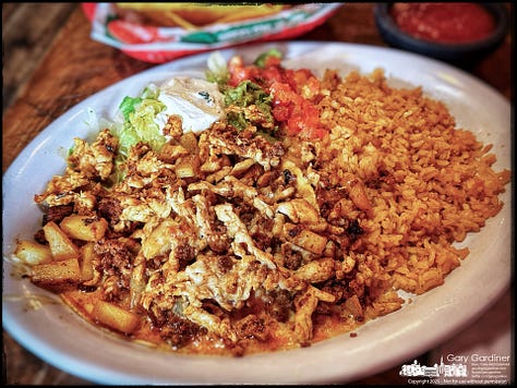 Pollo Nayarit. Grilled chicken strips over a bed of Mexican rice, covered with melted cheese. Served with guacamole salad, sour cream, tomato and tortillas. Side order not included.