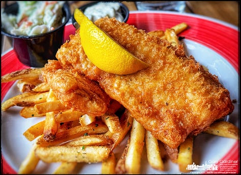 Fish and Chips. Beer-battered white fish, crystal remoulade, red pepper slaw, lemon, and fresh parsley.