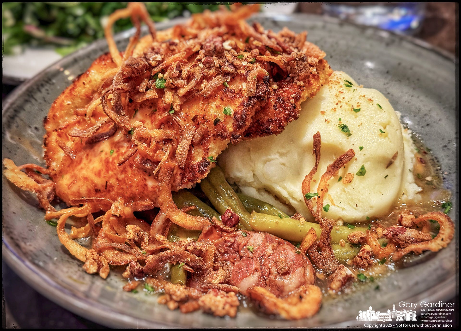 BBQ Glazed Meatloaf. Served with housemade roasted garlic mashed potatoes, lemon chili green beans topped with crispy potato straws.
