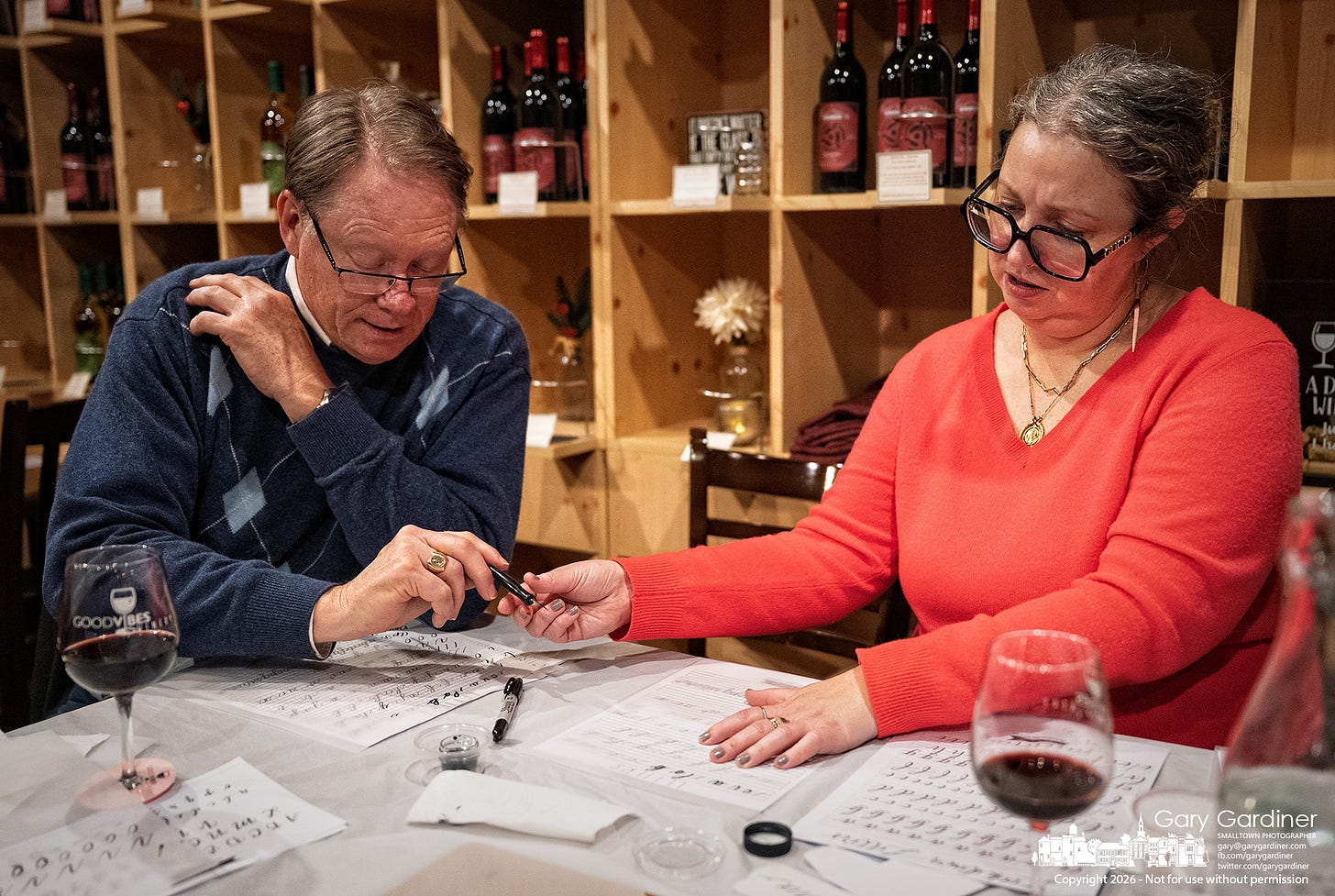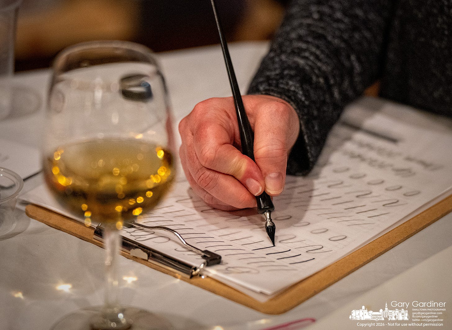 Good Vibes Winery hosted an evening calligraphy class titled “Sip and Sign,” where over a glass of their favored wine, students learned the narrow results of the up stroke and with broader lines of the down stroke during the evening.