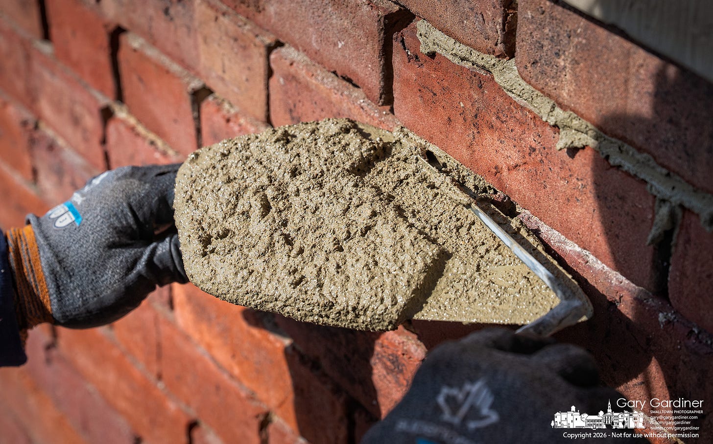 Along the exterior wall, masons chipped out deteriorating joints and pressed fresh mortar into the 168-year-old brickwork. Above each test strip, small wooden blocks labeled with the mortar’s name and color rested on the stone ledge, marking the sample inlaid directly beneath it. The first three colors laid Thursday were Nantucket, Medium Buff, and Dark Buff, with a fourth shade, White Oak, scheduled to be added Friday.