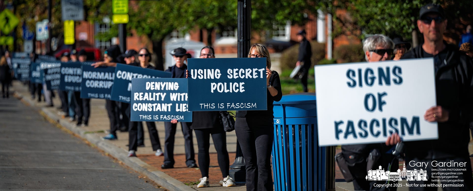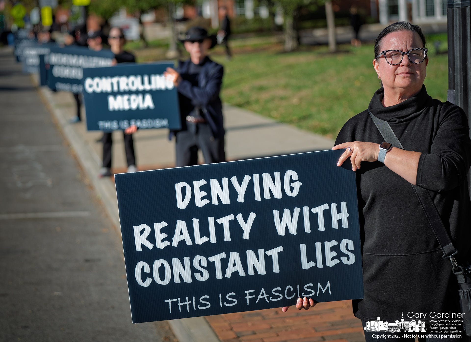 About 30 people stood quietly Thursday afternoon in Uptown Westerville, holding what they described as “Signs of Fascism,” highlighting policies and programs of the current administration that are evident in American society.
