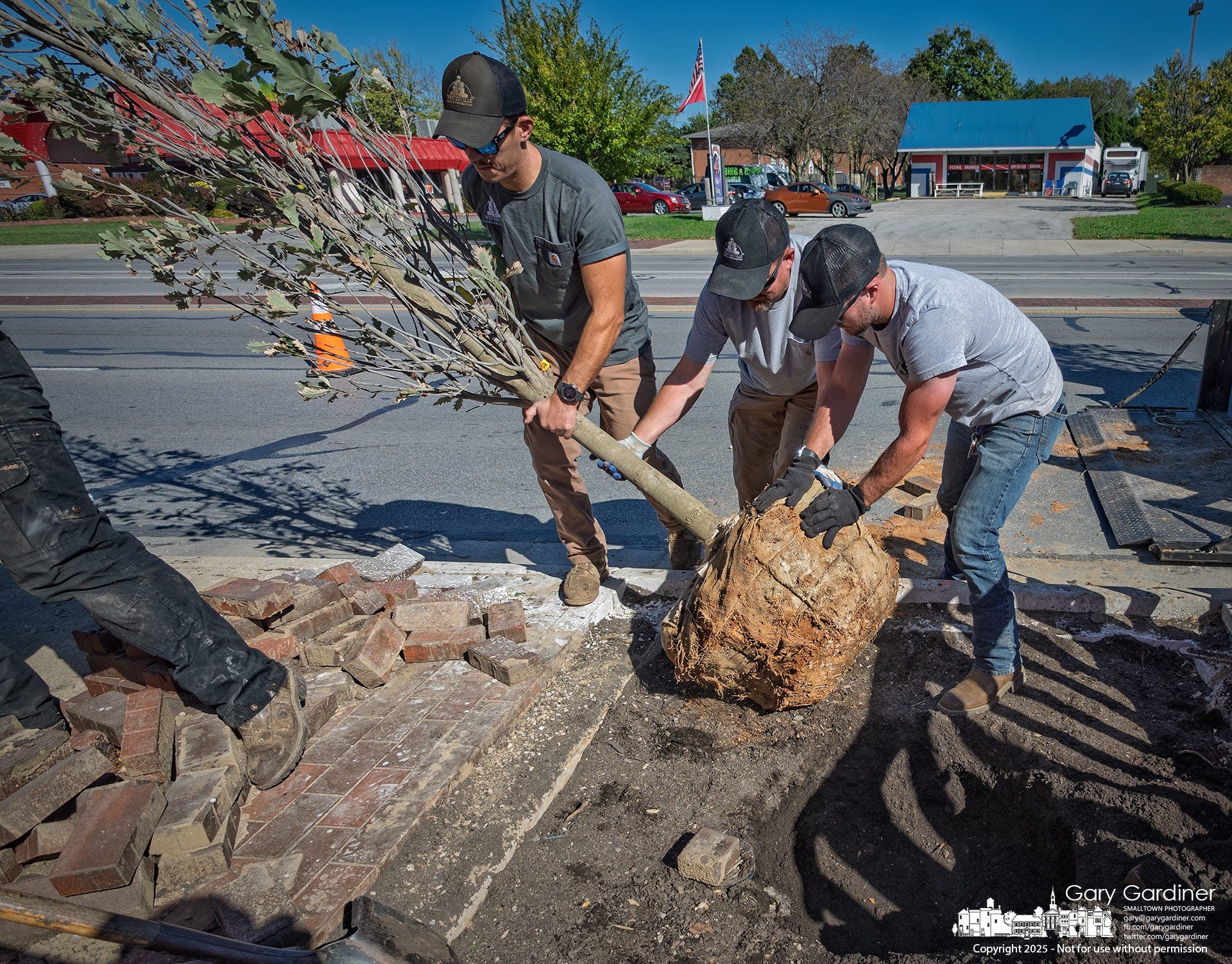 Westerville Parks and Recreation workers place a 2.5-inch Regal Prince Oak in place on South State Street on Thursday afternoon.