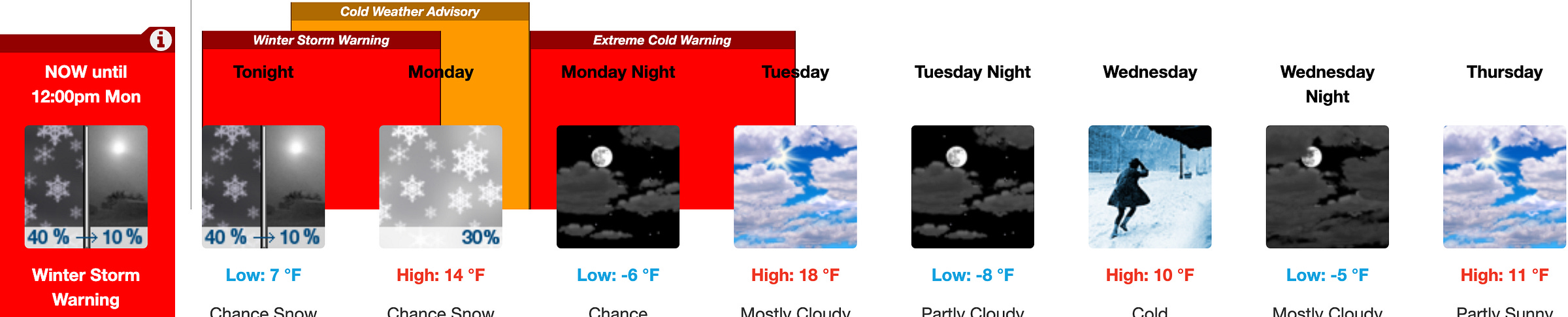 Wednesday remains partly sunny but very cold, topping out near 10 degrees. Mostly cloudy skies return overnight with lows around minus 5.