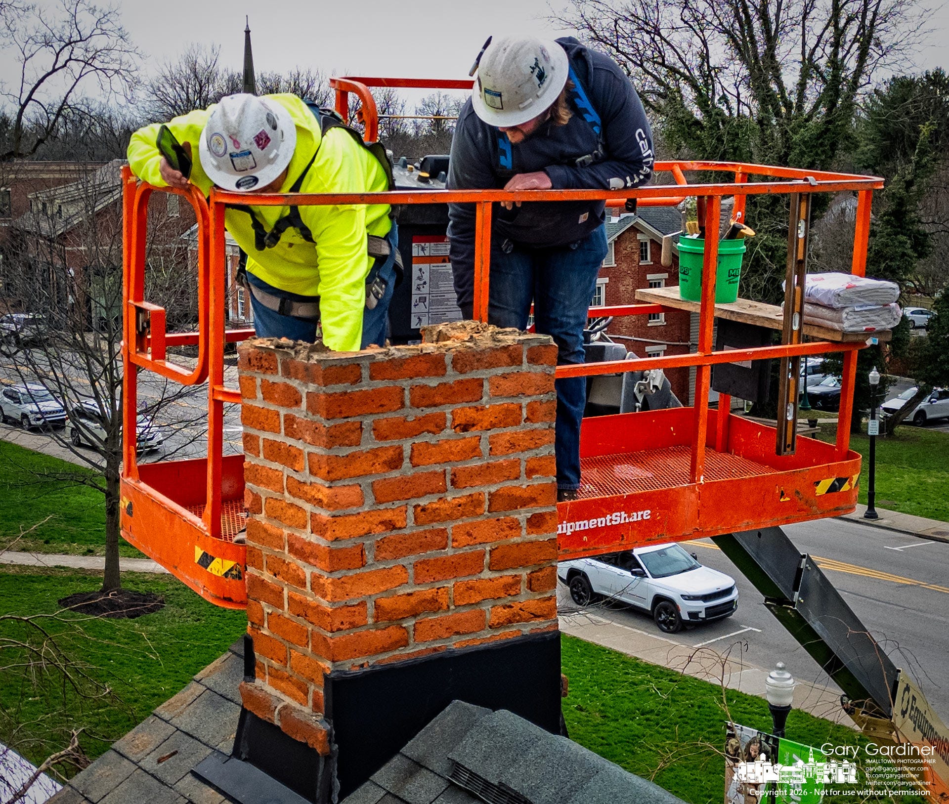 Restoration experts working on the building that houses the Westerville History Museum determined Wednesday that its chimney was structurally unsound and needed to be removed to the roofline. Brickmasons said erosion inside the 1850s chimney was so severe that they recommended replacing it with a new brick structure, adding that the original repair plan might not have been sufficient to support the large limestone cap planned for the top.
