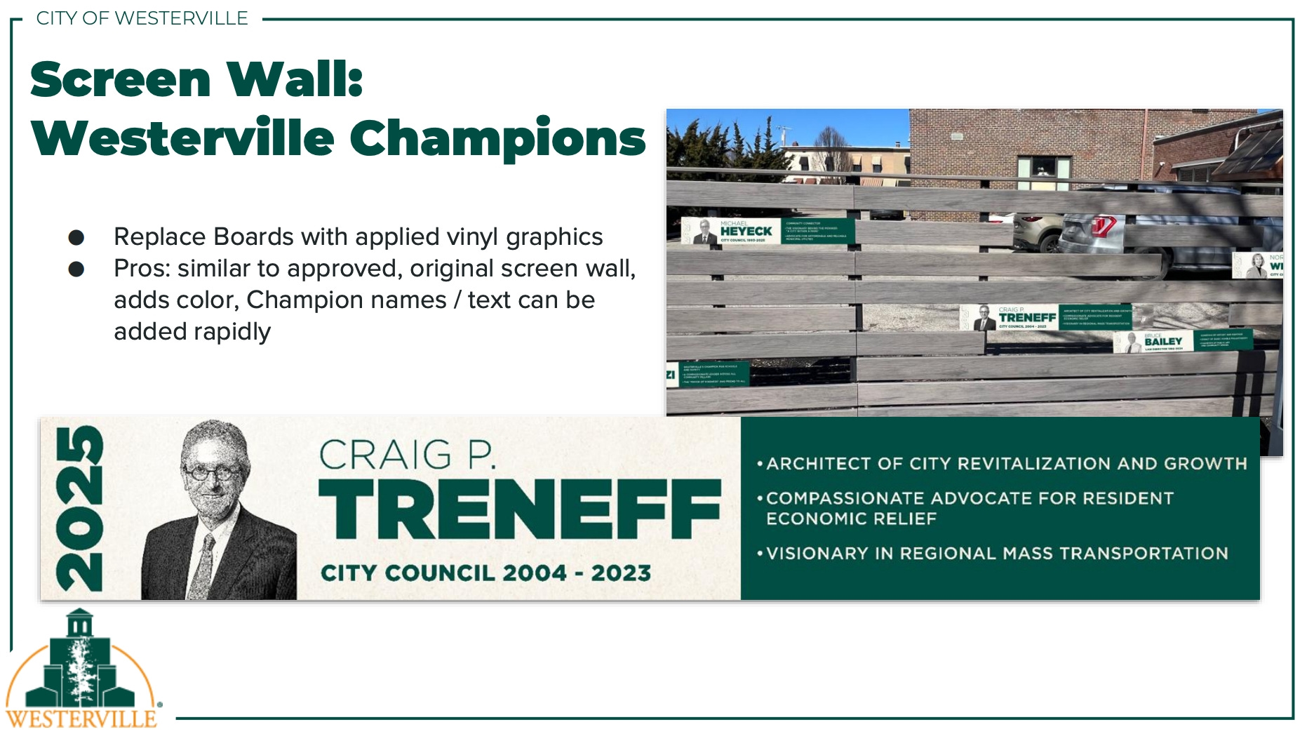 The request sought approval to modify the existing north via screen wall, which was originally approved as part of the 2015 City Hall improvements. The proposal described the change as a way to add Westerville Champions graphics to the current screen wall by replacing some existing boards with applied vinyl graphics.