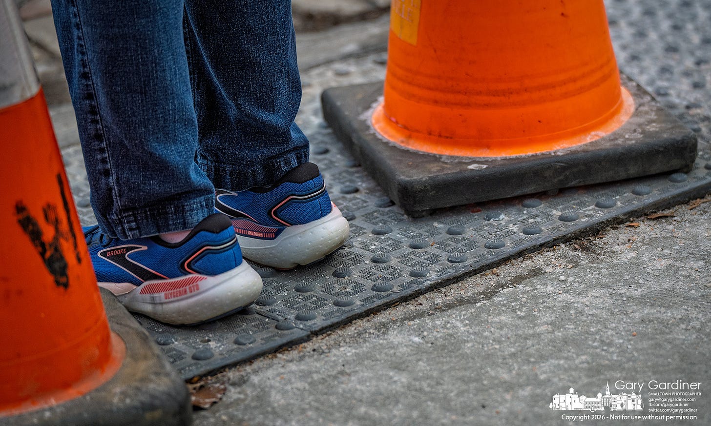Orange cones mark a section of the sidewalk at State and Main where the bubble-textured Detectable Warning Surface (DWS) pads have pulled loose, creating a hazard for pedestrians.