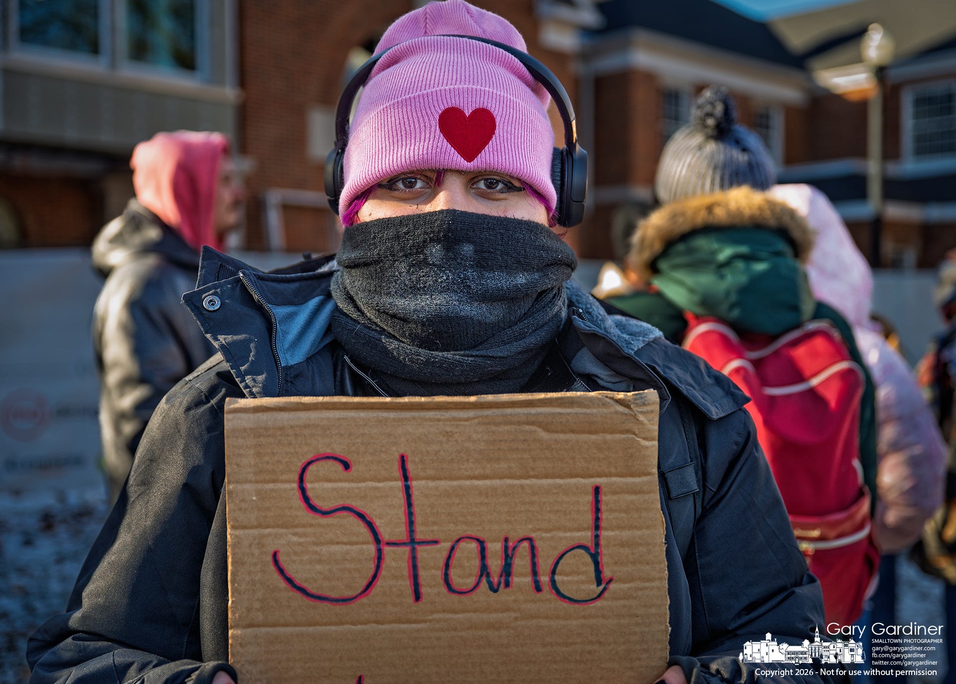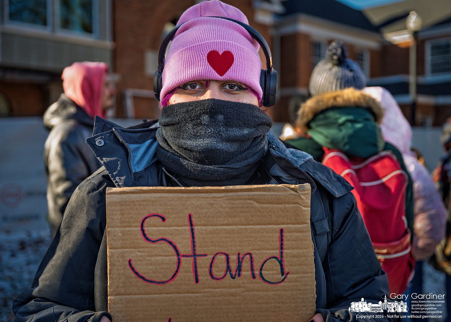 The demonstration was part of the nationwide “Free America Walkout,” timed to mark one year since Donald Trump’s second inauguration. Students assembled in the afternoon, bundled against the cold and carrying handmade signs, then walked to Uptown Westerville.