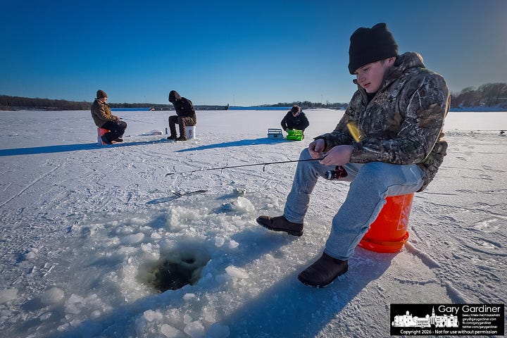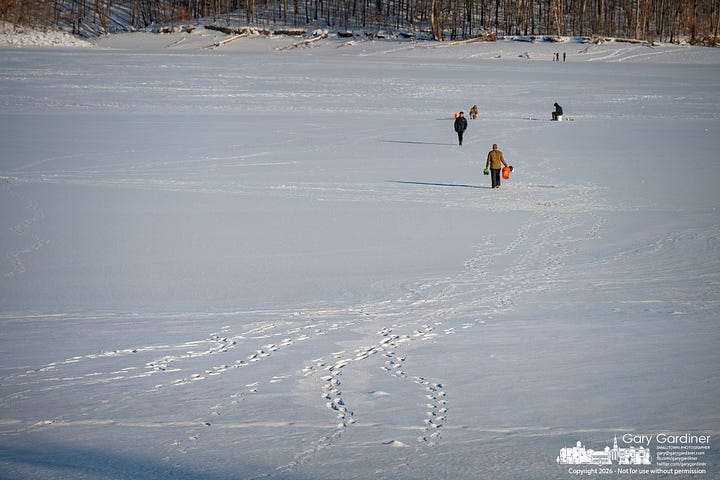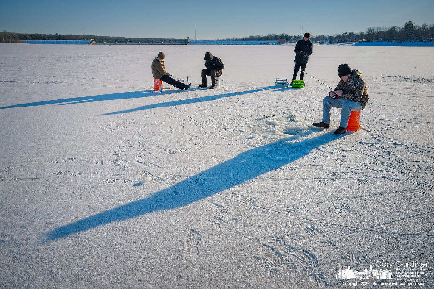 Anglers took advantage of the long, below-zero, and single-digit temperatures freezing the waters of Hoover Reservoir to try their luck at winter fishing. After testing the water near the shore for thickness and finding it was about a foot thick, the group ventured toward the center of the lake, where the ice was nine inches thick, hoping it might be a better spot than the shallower shoreline. While being photographed, no fish were caught.