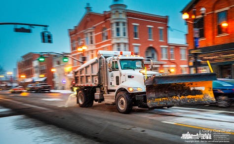 Crews applied brine and prepared roads ahead of a predicted snowstorm that dropped less than expected. A traffic change on West Main Street to westbound only was delayed by the weather.