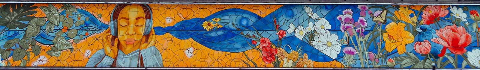 “The Natures,” the new public artwork by artist partners Westerville Central Art Teacher Jen Kiko and Eric Rausch, covers the west wall of The Pembroke with more than 3,000 handcrafted ceramic tiles. The mural features a woman wearing headphones, surrounded by mid-century patterns, houseplants, Ohio flowers, and small details that hint at the building’s history as the former WCOL radio station. At street level, it appears as a single image; up close, it breaks into thousands of shaped, glazed tiles, each hand-cut and carefully placed.