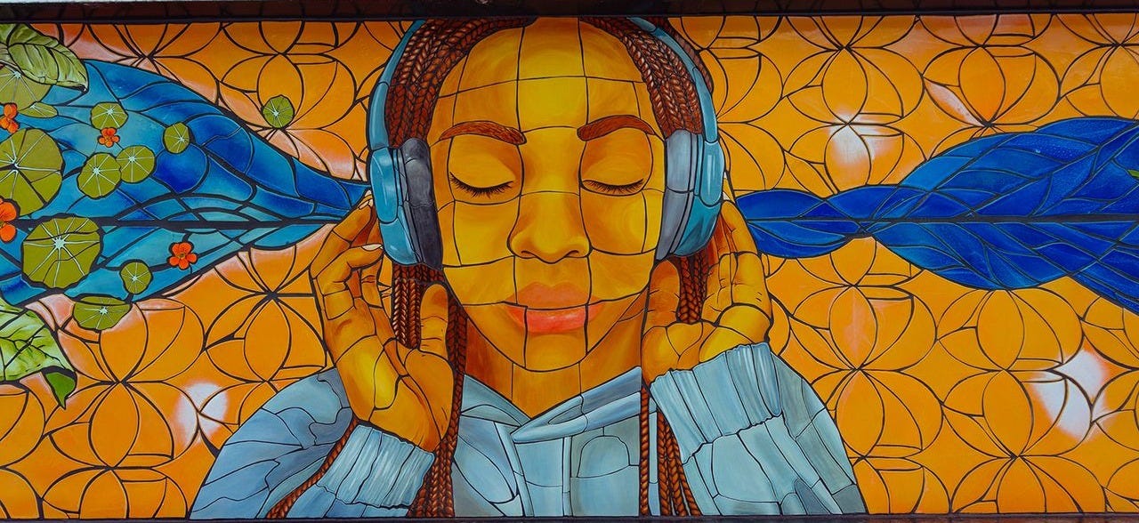 The mural captures the building’s layered history. Constructed in the late 1940s in a mid-century modern style, the structure once housed a radio station, and Kiko and Rausch wanted to incorporate that history directly into the piece. The background features a pattern adapted from the mid-century era, cut into repeating rounded tiles. The figure’s headphones symbolize the building’s broadcast past, and faint “sound waves” radiate outward from her, giving the scene a quiet pulse.
