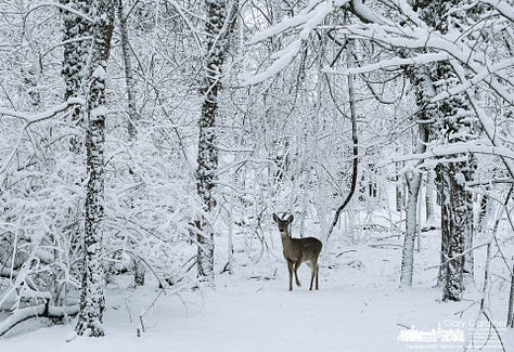 Fresh snow turned Hannah Mayne Park into a quiet retreat, where a small playground, twisting trees, and a bridge over a creek sat under a calm white cover. Footprints marked the trail while a lone deer stood near the woods before disappearing back into the stillness.