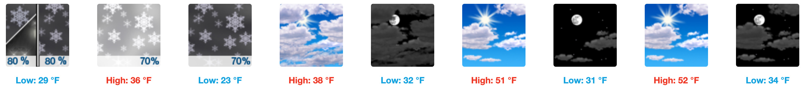 Monday starts off cold with scattered snow showers in the morning, tapering off by midday. Expect highs around 36 with a steady northwest breeze. Another round of light snow is likely overnight, with temperatures dropping into the low 20s.